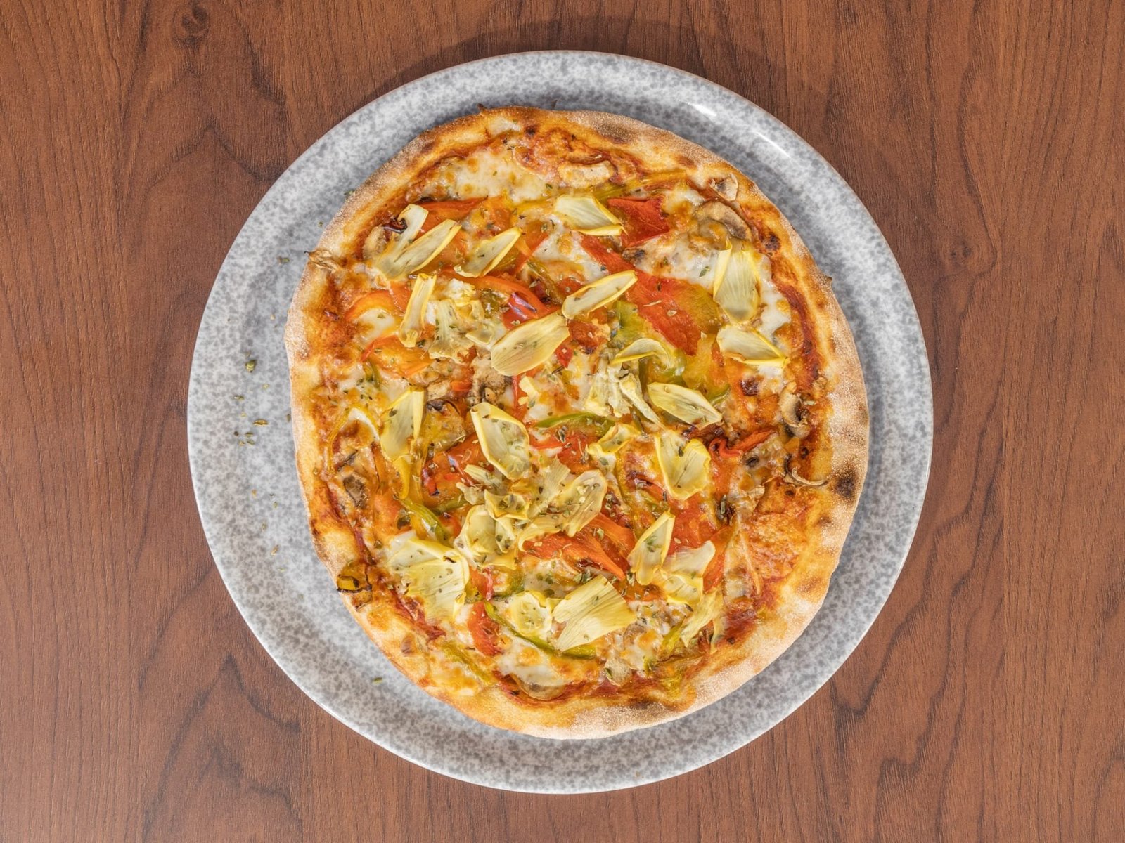 Tomate, mozzarella, champiñones, alcachofa, pimientos, cebolla y orégano